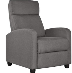 Descrierea produsului : Recliner tapițat cu material textil în gri neutru, cu scaun căptușit, spătar, cotiere și funcție de înclinare manuală. Produs vândut online, în special prin intermediul Amazon (ASIN: B0BDKX966B).