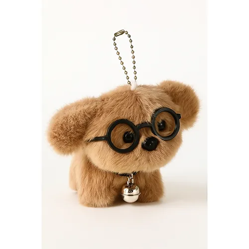 Jucărie de pluș, în formă de catelus maro, cu ochelari negri și un guler cu un clopot. Produs vândut online, în special prin intermediul Shein.