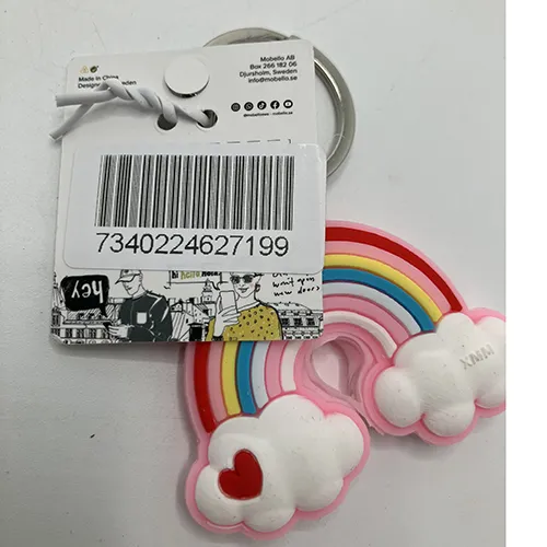 Descriere: Curcubeu din plastic cu nori atașați la un inel cu cheie, destinat ca un farmec pentru telefoane mobile și pungi.