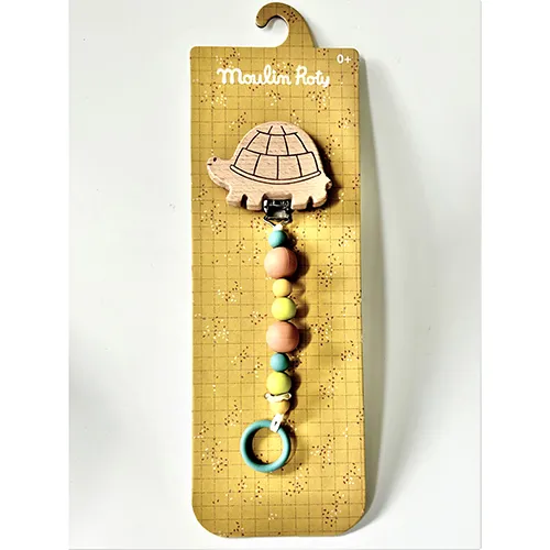 Descriere: Suport pentru suzetă. fabricat din lemn și silicon, inclusiv margele colorate și un element decorativ în formă de broască țestoasă.