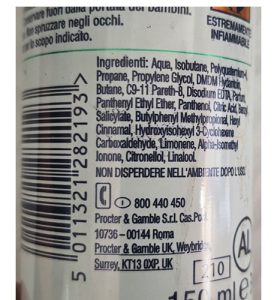 Pericol : În conformitate cu lista ingredientelor, produsul conține 2-(4-terț-butilbenzil) propionaldehidă (BMHCA), care este interzisă în produsele cosmetice. BMHCA poate dăuna sistemului reproducător, poate dăuna sănătății copilului nenăscut și poate provoca sensibilizarea pielii. Produsul nu este conform cu Regulamentul privind produsele cosmetice.