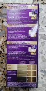 Descriere: Vopseaua de păr, care conține un tub de 50 ml de cremă colorantă, un flacon de 50 ml cu developator, un plic de 10 ml cu mască de îngrijire și o pereche de mănuși.