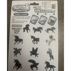 Pericol: Figurina unicorn se extinde cu mai mult de 50% în dimensiune atunci când este în contact cu apa. Dacă un copil îl pune în gură sau îl înghite, contactul cu saliva sau lichidele din stomac va determina extinderea figurinei, ceea ce poate duce la ocluzia căii respiratorii sau la blocarea intestinală. Produsul nu este conform cu cerințele Directivei privind siguranța jucăriilor și nici cu standardul european EN 71.