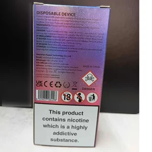 Pericol: Produsul conține o cantitate excesivă de lichid (20 ml) și o concentrație excesivă de nicotină (50 mg/ml). Acest lucru ar putea duce la consumul accidental al unei doze mari de nicotină. Nicotina este extrem de toxică și poate pune în pericol siguranța utilizatorului, în special dacă produsul intră în contact cu pielea sau este ingerat. Produsul nu respectă cerințele Directivei privind produsele din tutun.