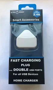 Încărcător USB alb cu două porturi. Tensiune de intrare: 110-240V AC, 50-60 Hz 0,15 A.