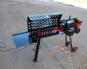 Despicător de bușteni electrici. Produsul este fabricat în 2021, are o tensiune de 230 V, o putere de 1,5 kW, un curent nominal de 16 A și o frecvență de 50 Hz și greutăți de 86 kg. Produs vândut online.