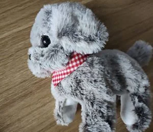Cățeluș de jucărie în blană sintetică gri, cu o eșarfă în carouri. Ochii jucăriei, nasul, cutia bateriei sunt realizate din plastic dur. Cutie de baterii cu două baterii AA 1.5 V de putere. Când butonul bateriei (în cutia bateriei) este pornit, cățelușul latră, rulează, dă din coadă.
