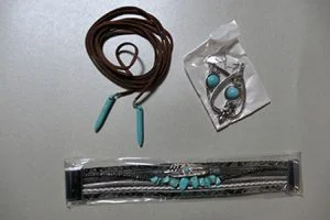 - Set de bijuterii constând dintr-un colier din piele cu pandantive din piatră turcoaz și cercei de culoare argintie cu pietre turcoaz și brățară multi-stradă cu pene și pietre turcoaz. Produsul este vândut online, în special prin intermediul Amazon Identifiers: LR3170 7.23, ASIN: B09QW942MX