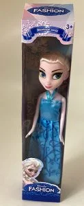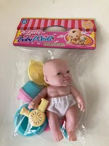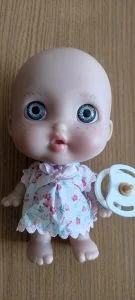 - Păpușă din plastic înaltă de 15 cm, cu cap mare și ochi albaștri, pentru copiii de peste 36 de luni.