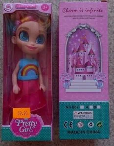 - Păpușă din plastic cu haine colorate.