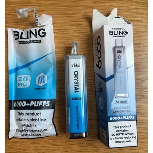 Descrierea produsului : Tigara electronica alb-albastra de unica folosinta intr-un ambalaj din plastic