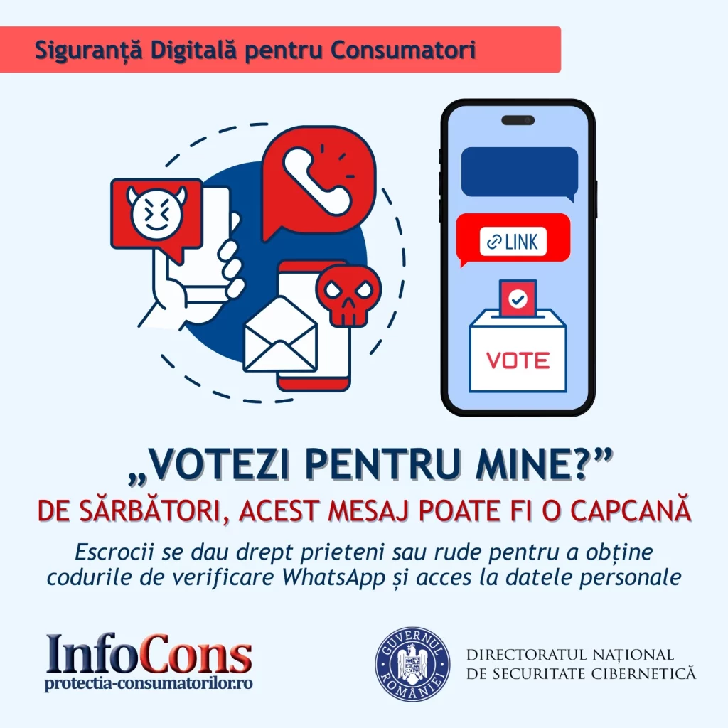 InfoCons protectia consumatorilor de securitate cibernetica : “Votezi pentru maine ” de Sarbatori acest mesaj poate fi o capcanaAdăugat la: 2025-12-02