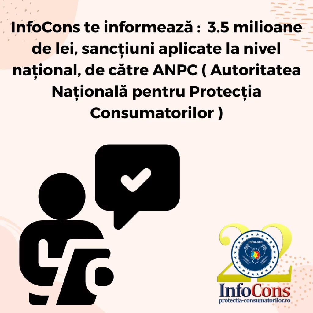 InfoCons te informează : 3.5 milioane de lei, sancțiuni aplicate la nivel național, de către ANPC ( Autoritatea Națională pentru Protecția Consumatorilor )Adăugat la: 2025-09-11