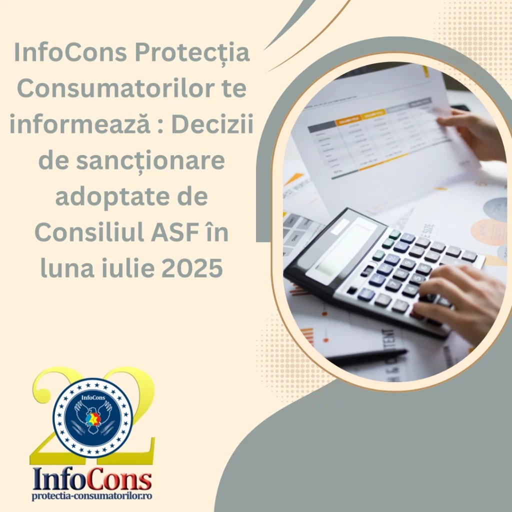 InfoCons Protecția Consumatorilor te informează : Decizii de sancționare adoptate de Consiliul ASF în luna iulie 2025Adăugat la: 2025-08-18
