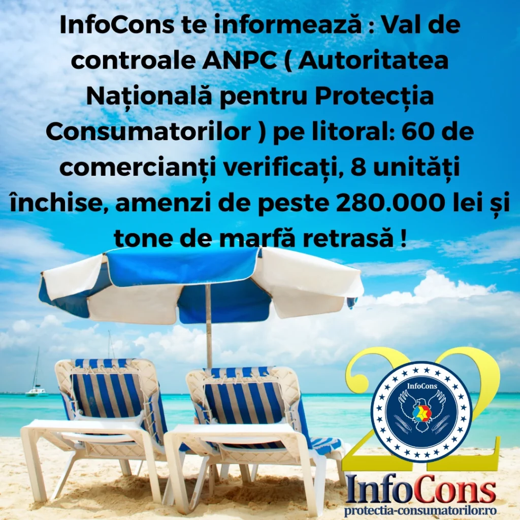 InfoCons te informează : Val de controale ANPC ( Autoritatea Națională pentru Protecția Consumatorilor ) pe litoral: 60 de comercianți verificați, 8 unități închise, amenzi de peste 280.000 lei și tone de marfă retrasă !Adăugat la: 2025-08-11