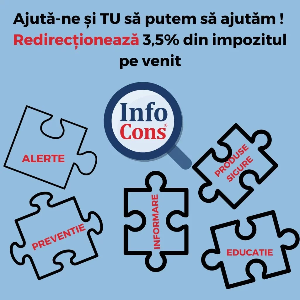 Ajută-ne și TU să putem să ajutăm ! Redirecționează 3,5% din impozitul pe venit către activitățile de prevenție , educare , informare și sociale ale InfoCons !Adăugat la: 2026-01-19