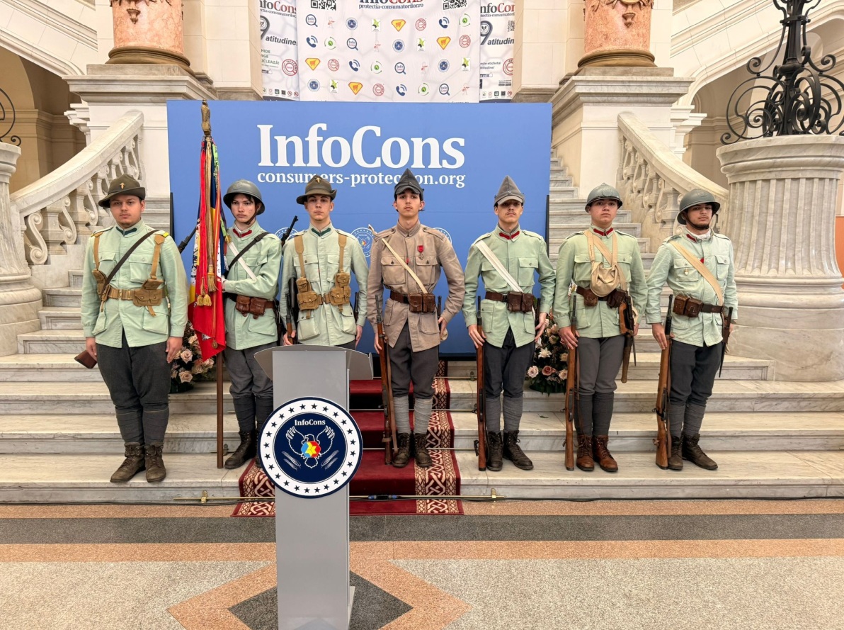 Pe tot parcursul desfasurarii evenimentul dedicat Zilei Mondiale a Drepturilor Consumatorilor și Zilei Mondiale a Proprietății Intelectuale, organizat de InfoCons în data de 13 martie 2026, la Palatul de Justiție București,au fost prezenti voluntarii Asociației Tradiția Militara purtand uniformele eroilor romani din Primul Razboi Mondial.