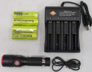 Descrierea produsului : Lanternă reîncărcabilă cu baterii reîncărcabile și un încărcător USB cu patru sloturi în negru. Numărul unității de stocare: X001LCK08V. Produs vândut online, în special prin Amazon (ASIN: BOB593MM84).
