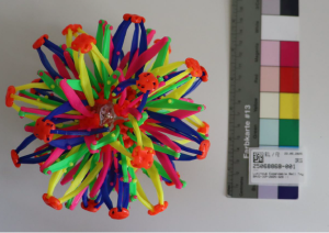Descrierea produsului :Jucărie cu bilă extensibilă din piese colorate, cu o sferă centrală care conține baterii cu trei butoane. Produs vândut online, în special prin intermediul Amazon (ASIN: BOF7FBXW7X)