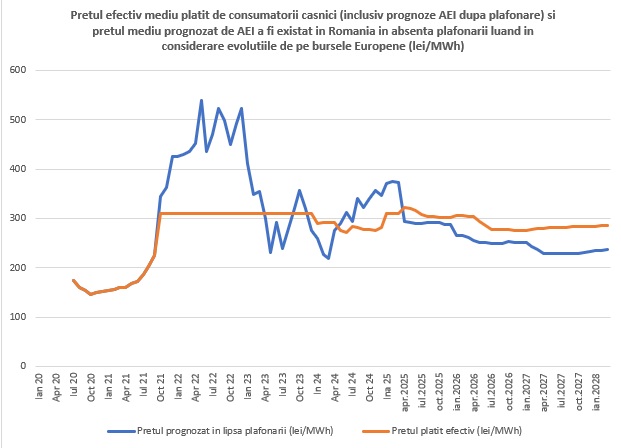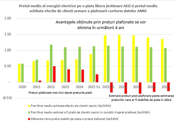 Analizând pentru perioada 2020 – 2025, evoluția prețului mediu achitat efectiv de clienți urmare a plafonării conform datelor ANRE și previziunile prețului mediu al energiei electrice care s-ar fi format pe o piață liberă, dacă nu se aplica plafonarea prețului (estimare AEI) și estimările de preț pentru cele două scenarii pentru următorii 4 ani se poate constata următoarele: