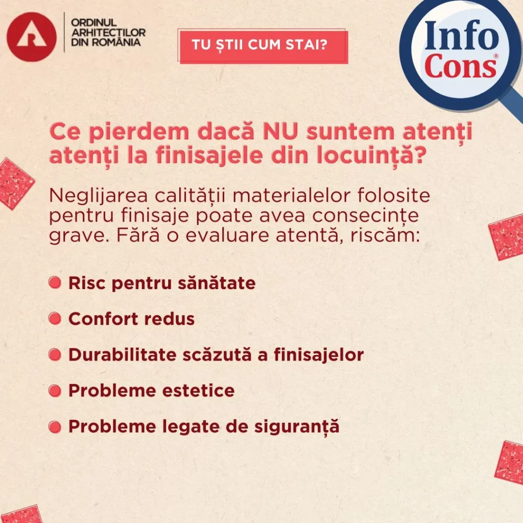 InfoCons protectia consumatorilor si Ordinul Arhitectilor din Romania te informeaza : Ce pierdem dacă NU suntem atenți la finisajele din locuință, atunci când vrem să cumpărăm sau să închiriem un apartament/ casă?