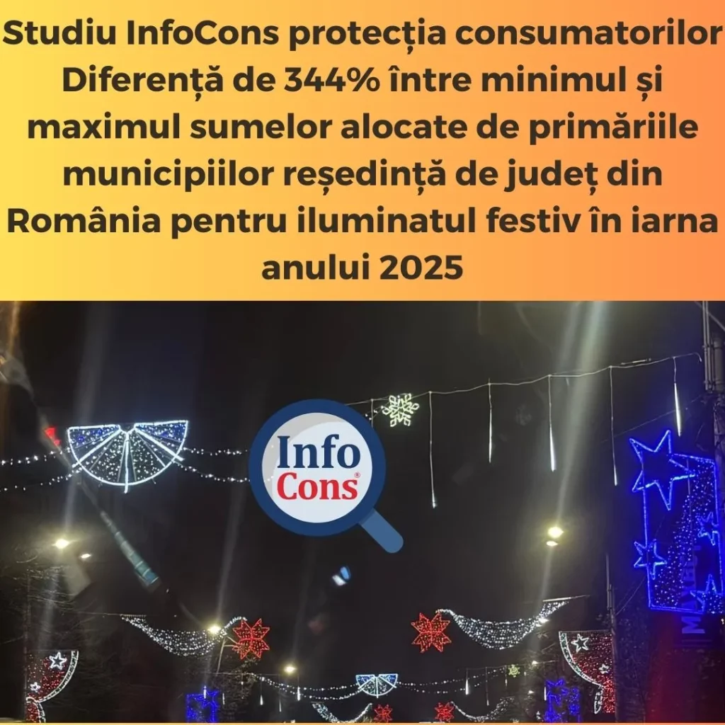 Studiu InfoCons protecția consumatorilor : Diferență de 344% între minimul și maximul sumelor alocate de primăriile municipiilor reședință de județ din România pentru iluminatul festiv în iarna anului 2025