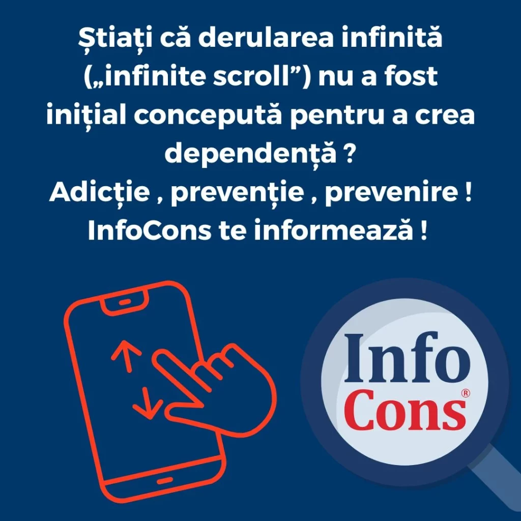 Știați că derularea infinită („infinite scroll”) nu a fost inițial concepută pentru a crea dependență ? Adicție , prevenție , prevenire ! InfoCons te informează !