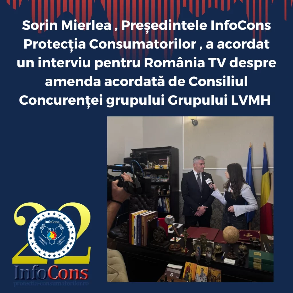 Sorin Mierlea , Președintele InfoCons Protecția Consumatorilor , a acordat un interviu pentru România TV despre amenda acordată de Consiliul Concurenței grupului Grupului LVMH ( Louis Vuitton – Moët&Chandon – Hennessy )