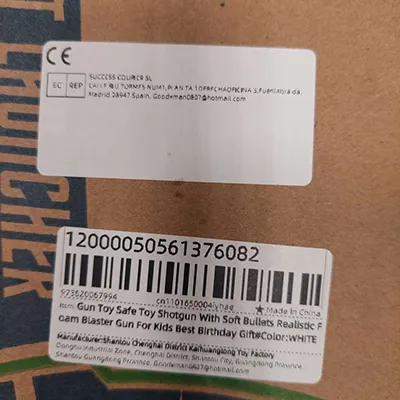 Alerta InfoCons Protectia Consumatorilor : Pistol de aer de jucărie din plastic în alb, albastru și negru, cu o pereche de ochelari, o țintă din carton, patru scoici și zece gloanțe de spumă gri cu cupe de aspirație albastre. Produs vândut online, în special prin intermediul AliExpress (identificator unic de produs: 1005009914110938).