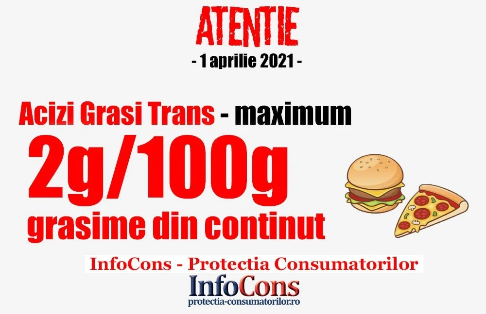 Incepand cu astazi, 1 aprilie 2021 au intrat in vigoare prevederile Legii nr. 182/19.08.2020 pentru stabilirea de acizi grasi trans in produsele alimentare destinate consumului uman, Lege publicata in Monitorul Oficial nr. 758/19.08.2020.