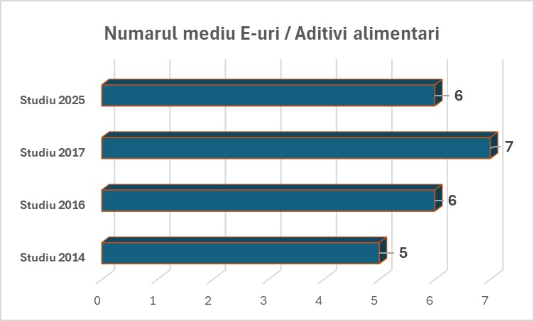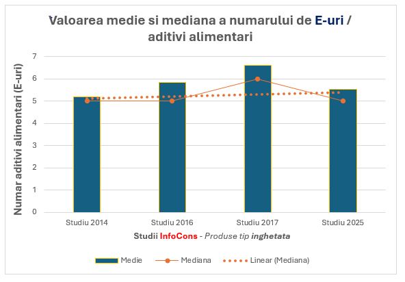 Valoarea medie de aditivi alimentari / E-uri pentru produsele tip inghetata analizate in cele 4 studii (2014, 2016, 2017 si 2025) este de 5.79 aditivi alimentari / E-uri aditivi alimentari, iar studiul din anul 2025 , fiind situat la o valoare medie de 5.52 a numericului de E-uri / aditivi alimentari .