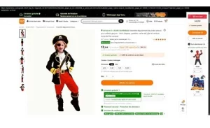Descrierea produsului : Costum de pirat, destinat copiilor, constând din pantaloni negri, roșii și galbeni, o jachetă neagră și galbenă cu nasturi falși în formă de bijuterie galbenă translucidă, o salopetă albă cu dantelă, o centură, o pălărie cu o imagine a unui craniu pe ea și un plasture de ochi negru ținut în loc de o bandă elastică. Produs vândut online, în special prin intermediul Amazon și Temu (identificator unic: 601102693958226).