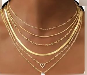 Descrierea produsului : Set de șase coliere. Un colier metalic de culoare cupru cu un farmec imitație de piatră prețioasă. Un colier din metal auriu cu un farmec de imitație de piatră prețioasă. Un lanț metalic auriu, simplu. Un lanț de legătură plat de aur. Un colier din metal auriu cu un farmec de inimă. Produs vândut online, în special prin intermediul Temu.