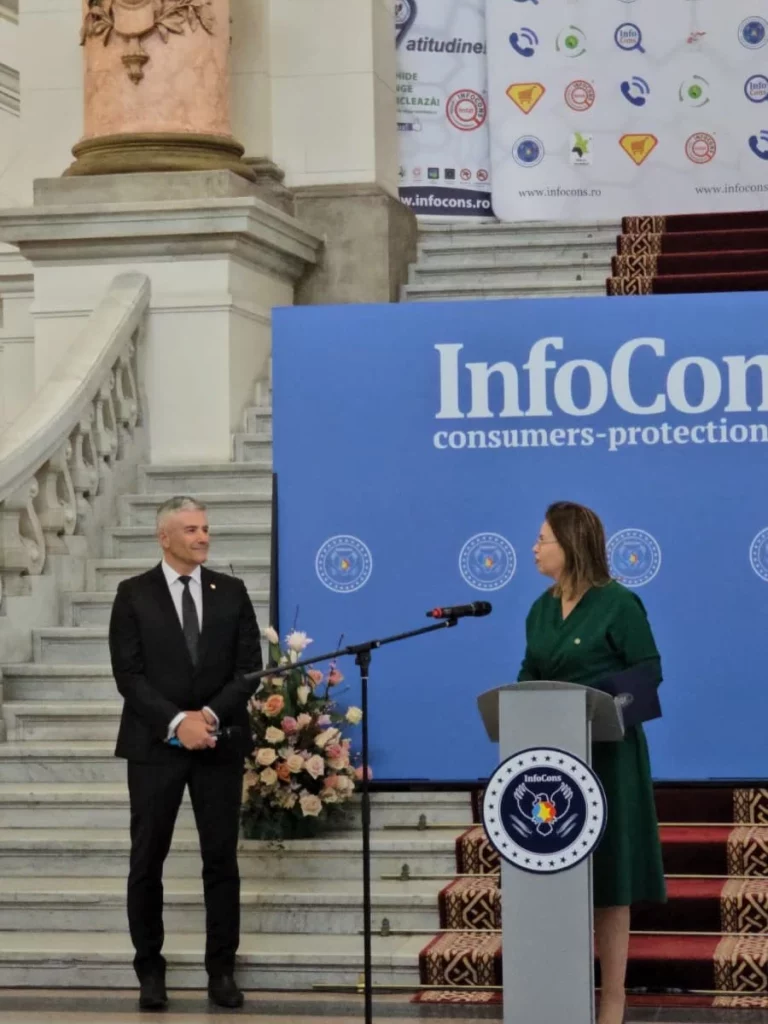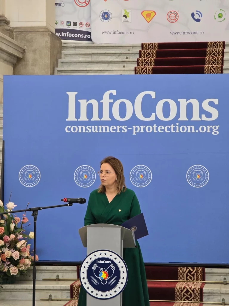 Decernarea Diplomei de Încredere acordată doamnei Oana Cambera, Consilier de stat în cadrul Cancelariei Prim-Ministrului, în cadrul evenimentului dedicat Zilei Mondiale a Drepturilor Consumatorilor și Zilei Mondiale a Proprietății Intelectuale, organizat de InfoCons în data de 13 martie 2026, la Palatul de Justiție București.
