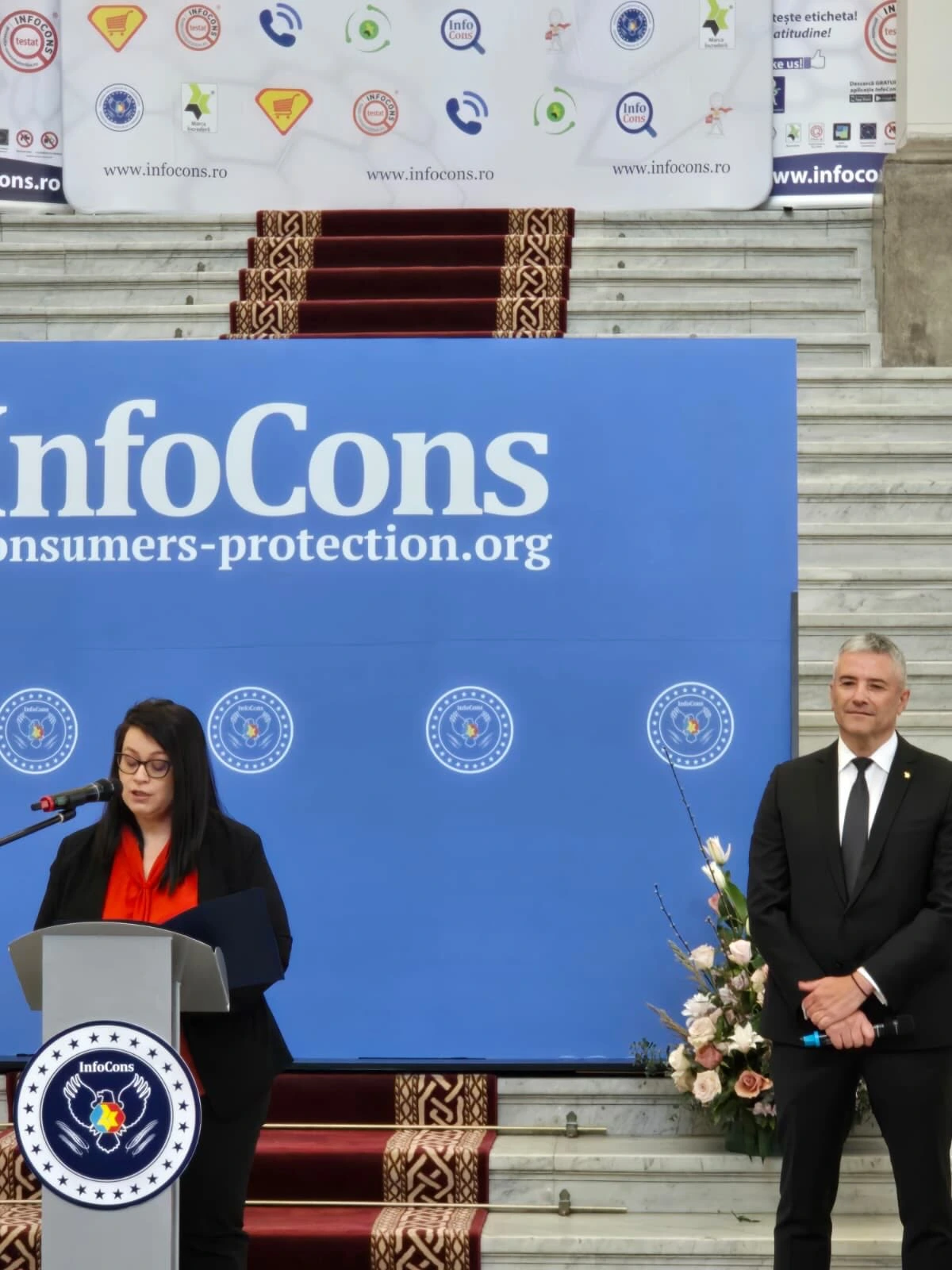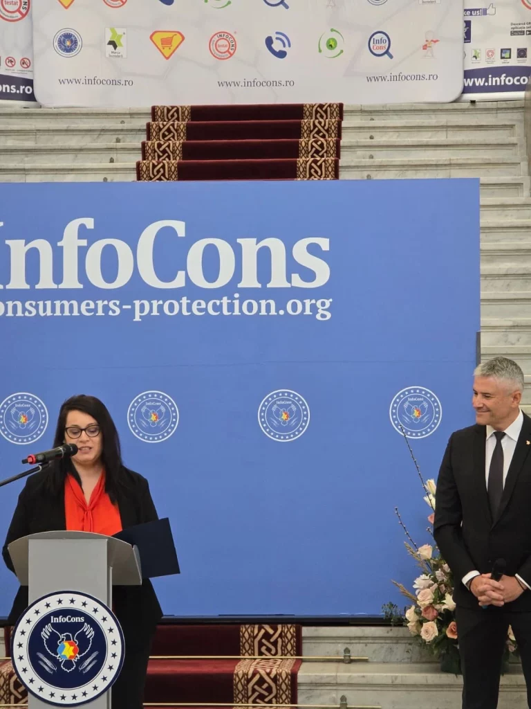 Decernarea Diplomei de Încredere pentru domnul Tánczos Barna, Viceprim-ministru al României, primită de reprezentanta Cabinetului domnului Viceprm-ministru, în cadrul evenimentului dedicat Zilei Mondiale a Drepturilor Consumatorilor și Zilei Mondiale a Proprietății Intelectuale, organizat de InfoCons pe 13 martie 2026, la Palatul de Justiție București.