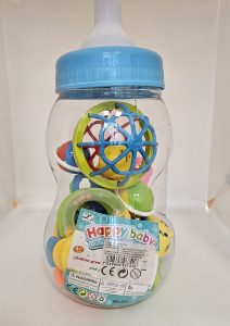 Descrierea produsului : Set de zornăitoare de jucărie, destinate copiilor, într-un pachet în formă de sticlă, inclusiv zornăitoare de diferite forme și culori.
