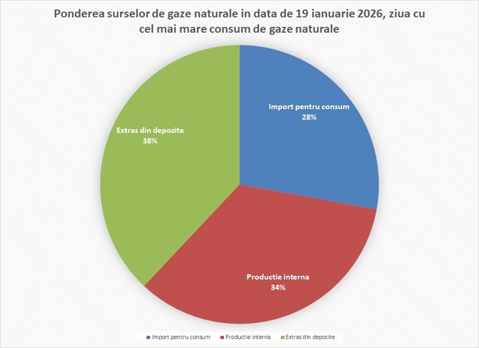 Gazele din depozitele de gaze au fost principala ”sursă” care a acoperit consumul în ziua cu cel mai mare consum de gaze din anul 2026, dar în fapt situația din România a fost salvată de gazele din import, care au avut cea mai mare flexibilitatea, având o creștere de aproape 500 % față de media lunii (față de 14% flexibilitatea gazelor din înmagazinare și 0,1% a gazelor din producția internă).
