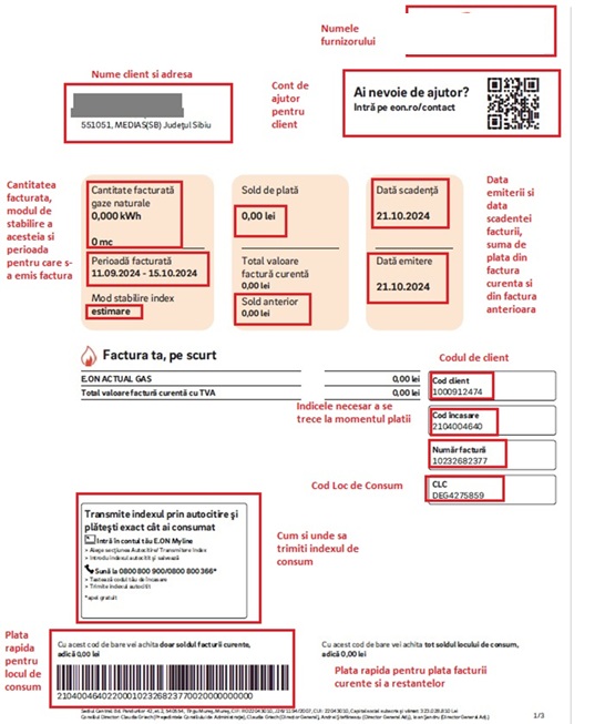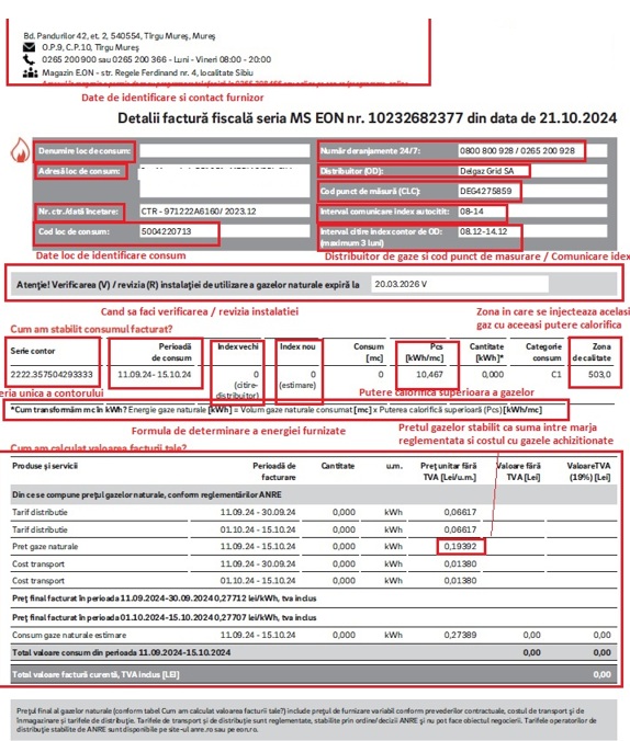 Astfel pe factură se identifică modul în care este codificat consumatorul, locul de consum, locul de măsurare, numărul contractului și al facturii, informații utile pentru plata facturii curente, dar și a restanțelor existente. De asemenea se regăsesc informații privind seria contorului, cantitatea volumică măsurată și perioada între două citiri (inclusiv indexul), dar și zona de calitate în care se găsește consumatorul, care este o zonă stabilită de ANRE ca fiind zona în care curge gazul cu aceeași putere calorifică și puterea calorifică superioară determinată pentru acea zonă/loc de consum.