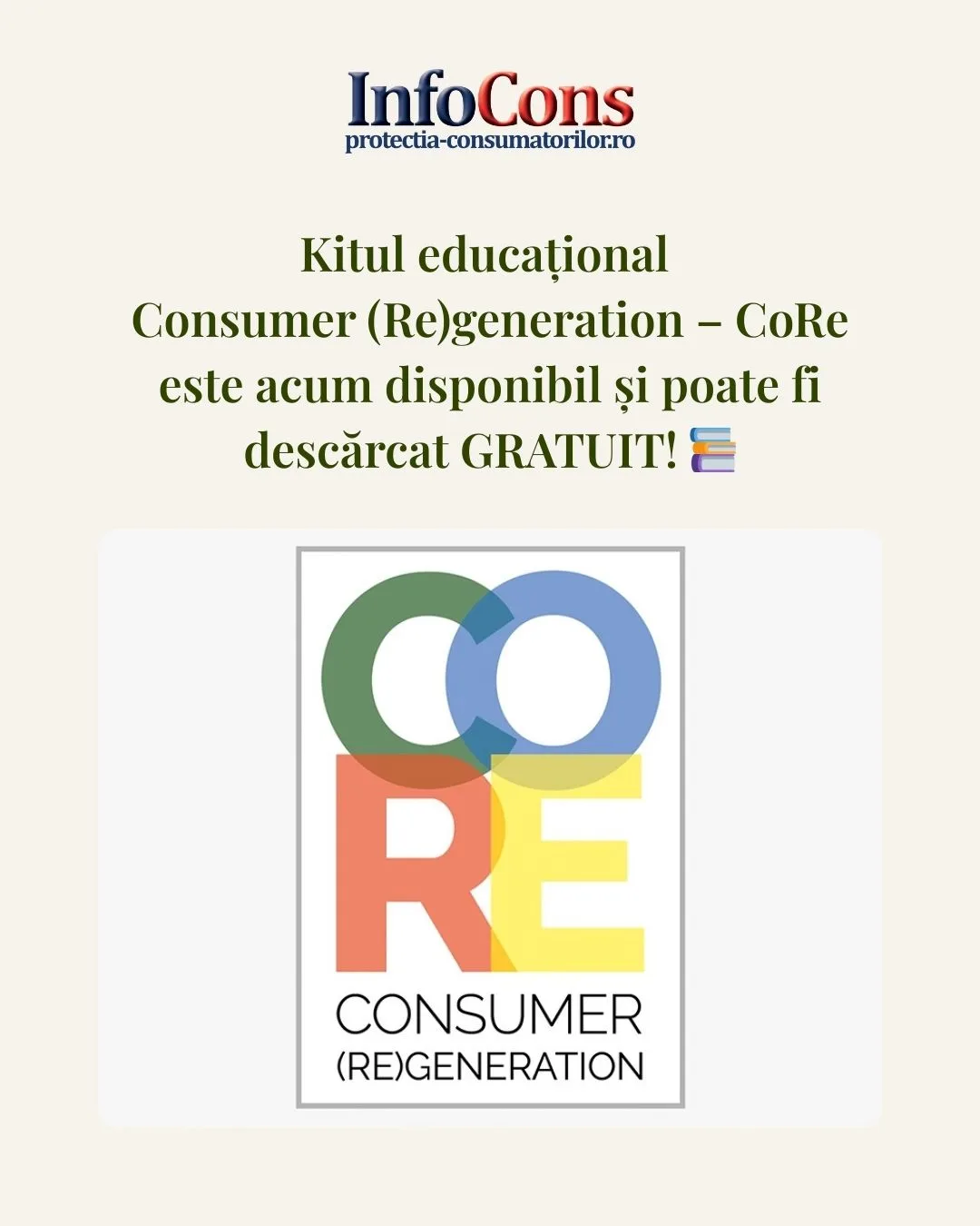 InfoCons, în calitate de partener al proiectului european Consumer (Re)generation – CoRe, anunță cu bucurie finalizarea și publicarea kitului educațional dedicat drepturilor consumatorilor, un instrument inovator creat special pentru profesori și elevi din ciclul gimnazial.