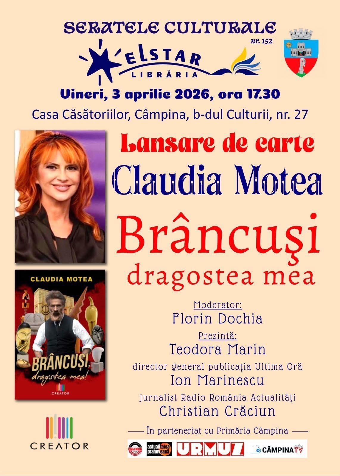 Vineri, 3 aprilie 2026, de la ora 17:30, la Primarie, Casa Casătoriilor din Câmpina (Bd. Culturii nr 27) va avea loc lansarea volumului „Brâncuși, dragostea mea” de Claudia Motea, în cadrul ediției cu numărul 152 a „Seratelor Culturale Elstar”. Evenimentul se înscrie într-un parcurs amplu al cărții, care a fost deja prezentată cu succes în numeroase orașe din România și în importante centre culturale internaționale, în Franța, Elveția, Spania, Belgia, Bulgaria, Republica Moldova și Statele Unite ale Americii, întâlnindu-se peste tot cu un public receptiv și emoționat.