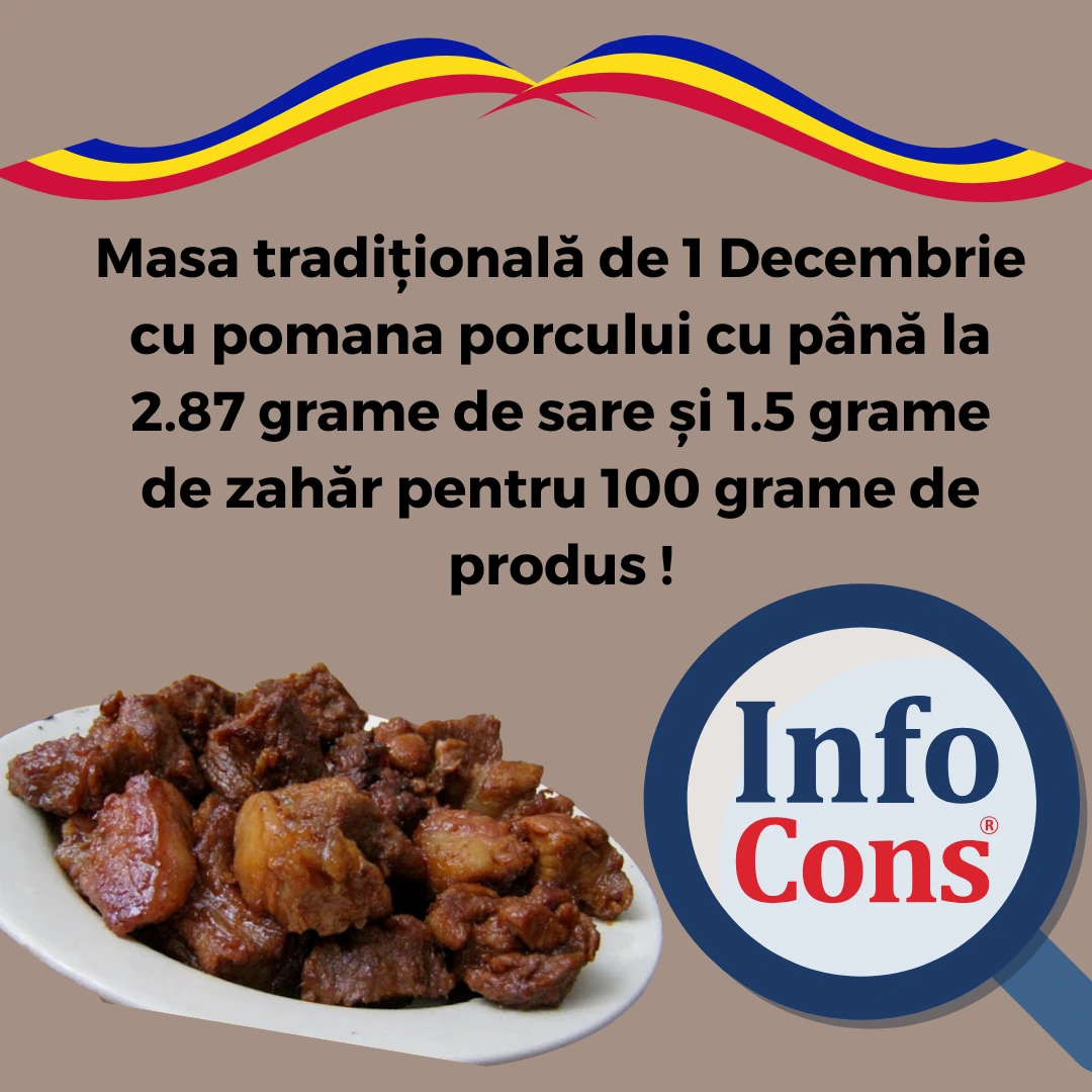 Masa tradițională de 1 Decembrie cu pomana porcului cu până la 2.87 grame de sare și 1.5 grame de zahăr pentru 100 grame de produs !