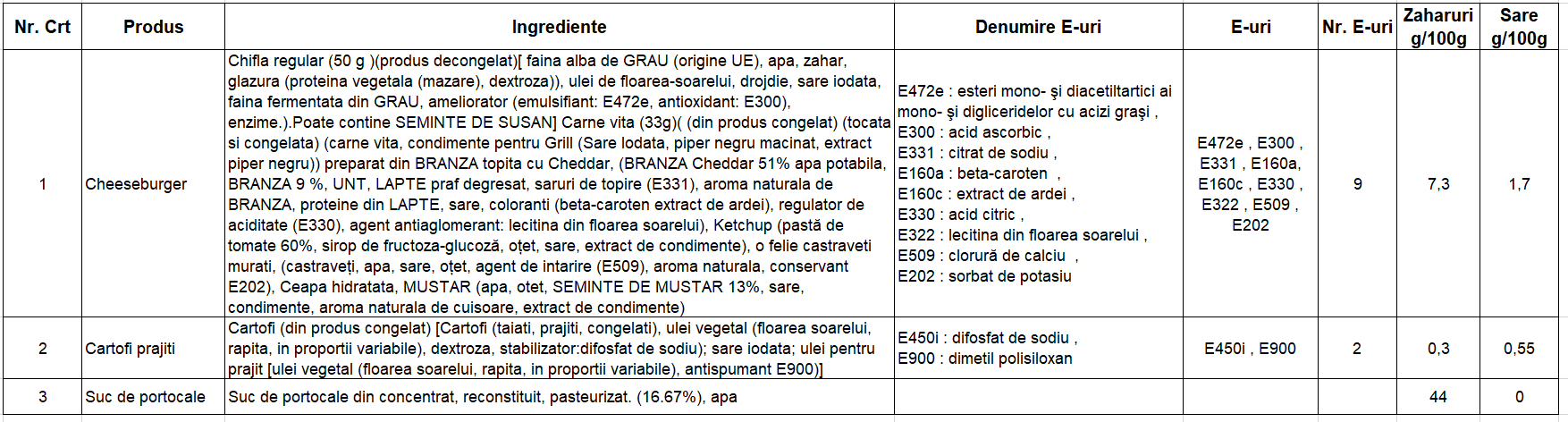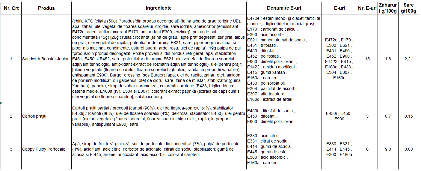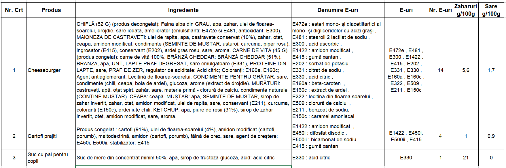 - Pui Burger – 25 aditivi alimentari , 7.19 grame de zaharuri și 0.52 grame de sare ;
