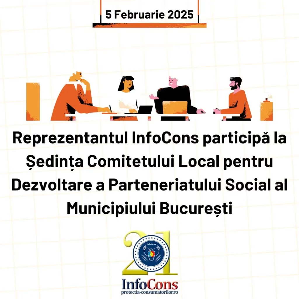 Reprezentantul InfoCons participă la Ședința Comitetului Local pentru Dezvoltare a Parteneriatului Social al Municipiului BucureștiAdăugat la: 2025-02-05