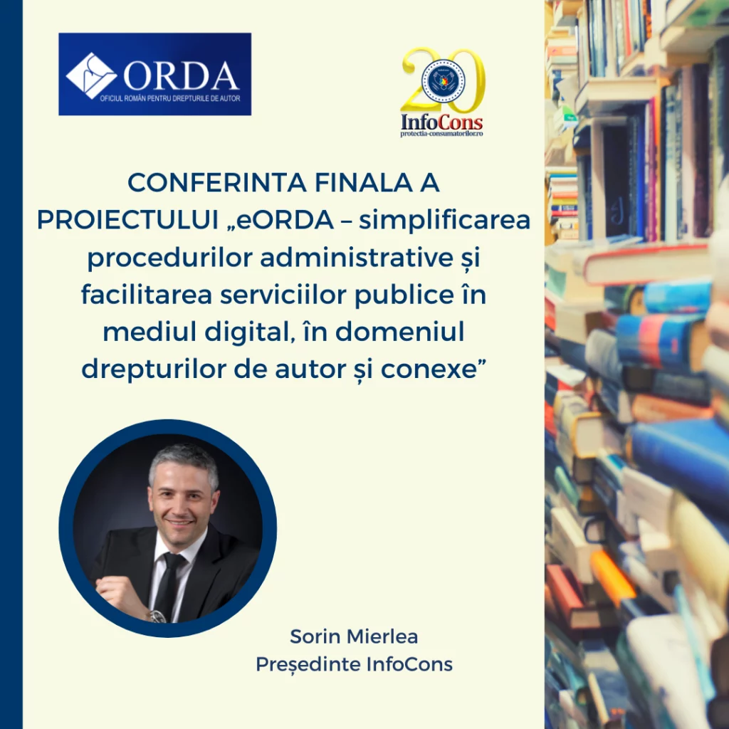 Președintele InfoCons, Sorin Mierlea participă la Conferința Finală a Proiectului eORDA – simplificarea procedurilor administrative și facilitarea serviciilor publice în mediul digital, în domeniul drepturilor de autor și conexeAdăugat la: 2023-11-28