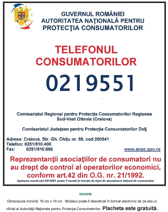 1. La articolul 1, alineatul (1) va avea următorul cuprins:’Art. 1. – (1) Pentru corecta informare a consumatorilor şi pentru a le da acestora posibilitatea să afle informaţii referitoare la modul în care pot face sesizări ori reclamaţii cu privire la produsele şi/sau serviciile ce le sunt puse la dispoziţie, operatorii economici au obligaţia să afişeze numărul de telefon denumit TELEFONUL CONSUMATORILOR – 0219551, adresa şi numerele de telefon/fax ale comisariatelor judeţene pentru protecţia consumatorilor în a căror rază teritorială se află operatorul economic, precum şi adresa site-ului Autorităţii Naţionale pentru Protecţia Consumatorilor: www.anpc.gov.ro.’