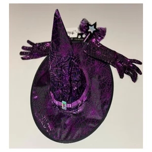 Descrierea produsului : Costum de vrăjitoare din trei piese, cu o pălărie neagră cu model, o baghetă cu plasă și o pereche de mănuși negre cu model.