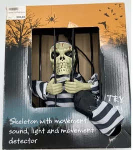 Descrierea produsului : Baterie operată de Halloween produs de decorare cu un schelet într-o cușcă. Produsul are funcții de sunet, lumină și mișcare.