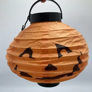Descrierea produsului : Felinar portocaliu, care amintește de un dovleac de Halloween. 20 cm în diametru cu detalii din plastic negru.