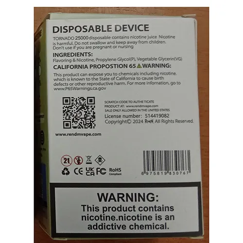 Pericol: Produsul are o cantitate excesivă de lichid care conține nicotină (valoare declarată: 21 ml). Acest lucru ar putea duce la consumul accidental al unei doze mari de nicotină. Nicotina este extrem de toxică și poate pune în pericol siguranța utilizatorului, în special dacă produsul intră în contact cu pielea sau este ingerat. În plus, produsul nu este etichetat suficient, deoarece ambalajul unitar nu include informații privind cantitatea de nicotină din doză sau o listă completă a ingredientelor. Produsul nu respectă cerințele Directivei privind produsele din tutun.