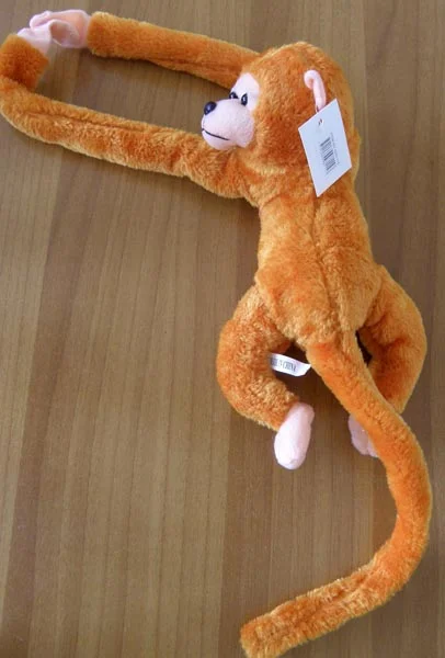 Descriere: Maimuțe de pluș cu ochi și nas negre din plastic și cu velcro pe mâini. Prin presarea burtei maimuțelor, maimuța emite sunete. Produsul se vinde fără ambalaj.